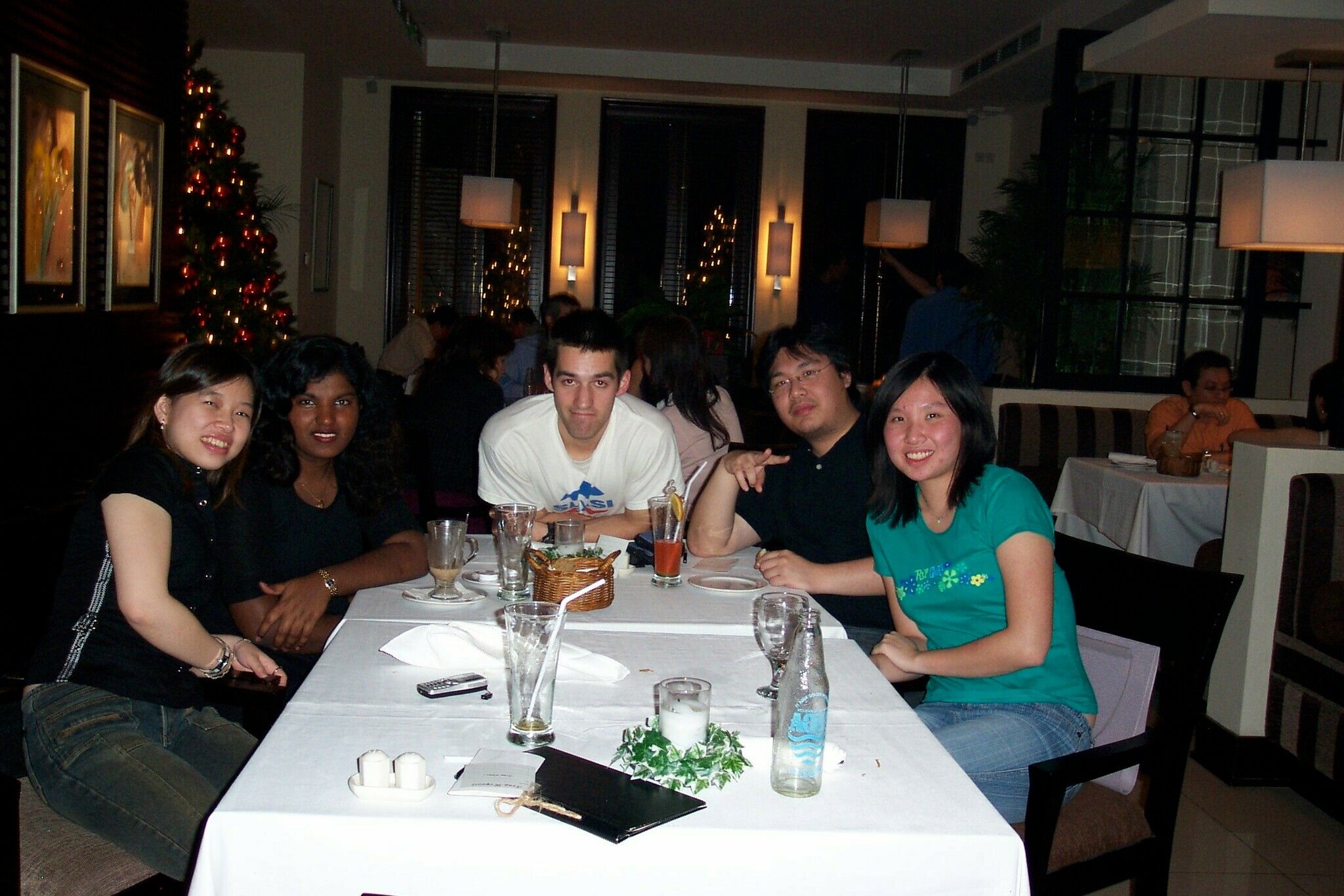 Dinner with friends at a fancy restaurant. It's too hot to worry about dress-codes.