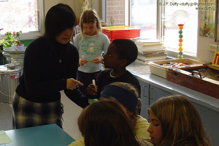 The little lady went to Myris's Mom's elementary school to teach the 2nd graders Origami. I have to admit you need a lot of energy to handle these kids.