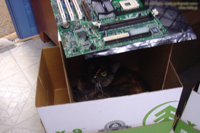 A little prep time for the fest tomorrow. "Bear" the cat found a home under a blown motherboard for a while. We're doing a classic fest tomorrow so there is a huge amount of prep work. Getting 5 Pentium machines up and running on a IPX network is no small task. 10+ year old hardware can be hard to get going. The oldest part was probably the IBM keyboard on Mitchlock's "Doom Machine" from 1984.