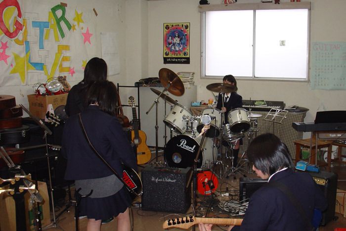 These are the girls in the school rock band. They are really good! I have a small video from my digital camera too, if you want to hear them-- let me know. Three guitars, drums, but no vocals. Something about the school uniforms makes me think Japanese Beatles.