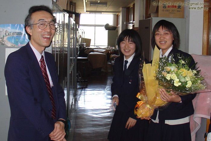 Today all the teachers who changed schools returned to their old schools for the afternoon. Teachers are required to change schools every 10 years, and have only minimal say in where they are reassigned. In this picture some students are giving flowers to one of our very popular former teachers.