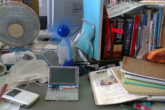 My desk at work. Two fans, no air conditioner. The heat index in my office was 99'F or 37'C. I had a terrible day. Thank heavens the forecast calls for rain for the next few days. I'll take drenching rain to sweltering heat any day of the week. Today around noon, I asked my boss if I could bring a Kiddy-Pool into work. I was being dead-serious, but I assume he was joking around when he agreed it was a good idea. If they cost $8.95 like they do at home, I might bring one in just for a laugh.