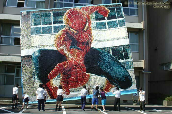 Wow, you have to check this out. For the school festival, a class created a huge Spiderman facade for the school! This isn't exactly an ink-jet printer job. We're talking 90,000 individually hand glued pixels!