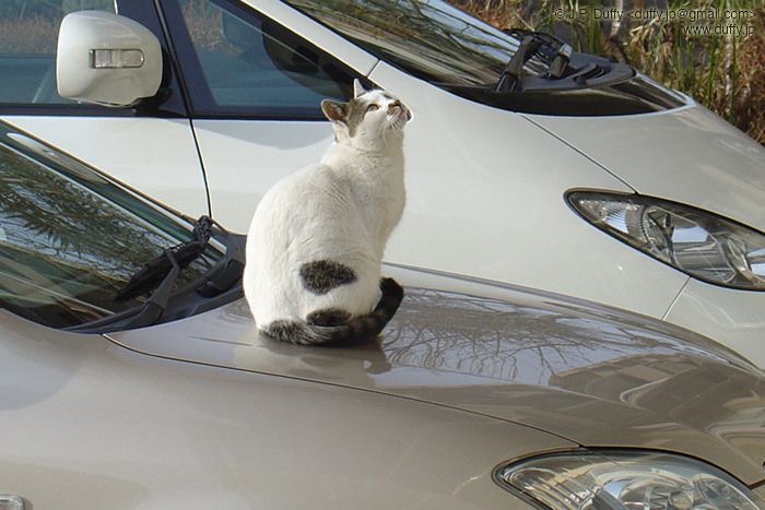 The school cat loves sitting on cars (and providing kittens to high school kids).