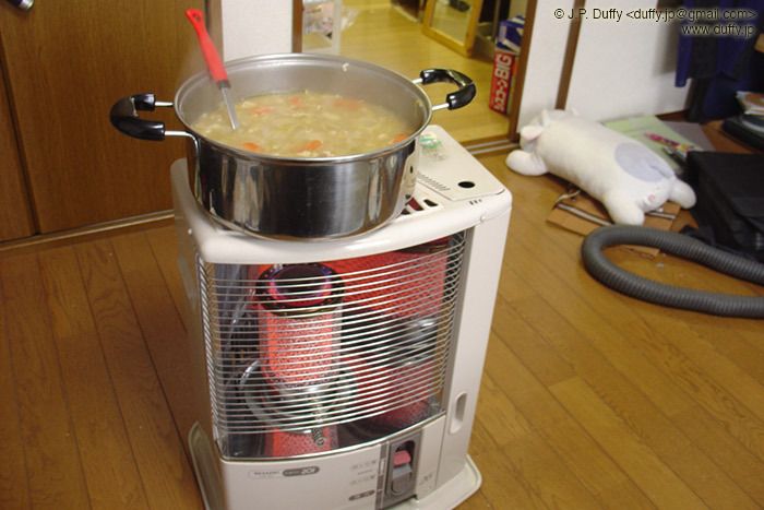 I cooked up some chicken soup today. Not exactly Campbell's; potatoes, carrots, onions, sauteed mushrooms, cabbage, and of course chicken. I kept the pot warm (actually simmering) on my room heater while I ate.