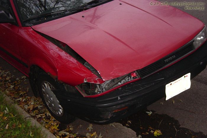 I was hit by an elderly couple today. Here ends the tale of the Medmobile. This was my sister's car when she was in med school. It doesn't look too bad, but the bumper is jammed up in the wheel-well.