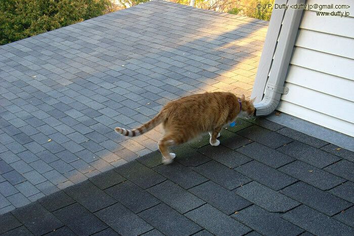 Bad Kitty! I opened the window for a second to throw out a bug, and she jumped out. I had to climb up onto the roof to get her. I finally get her back inside, and she runs right up to the same window and paws at the screen. It was quite an adventure for a house cat. Just don't show this to my roommate, it's his cat.
