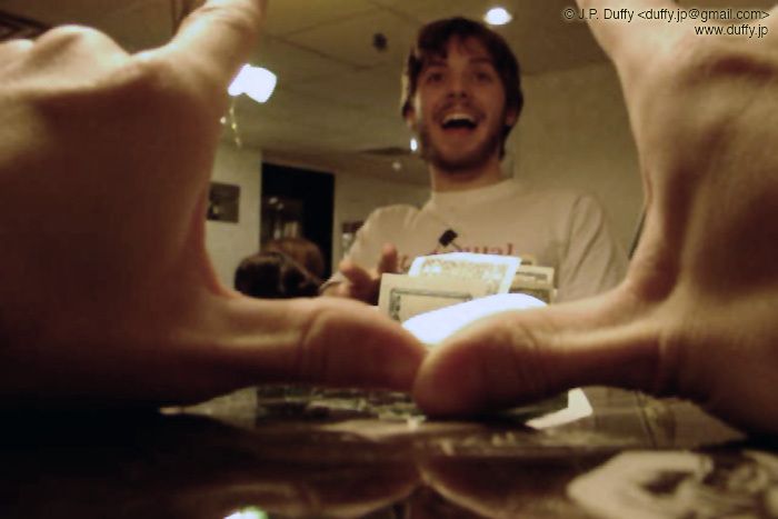 I missed Taco night on Thursday because I was feeling crappy, so I met up with everybody tonight. This is an action shot of Mitchlock scoring a finger-football field-goal. After the score, two of us at the table called out "Four Points!" while the remaining two people laughed. Apparently that is not the value of a field-goal.