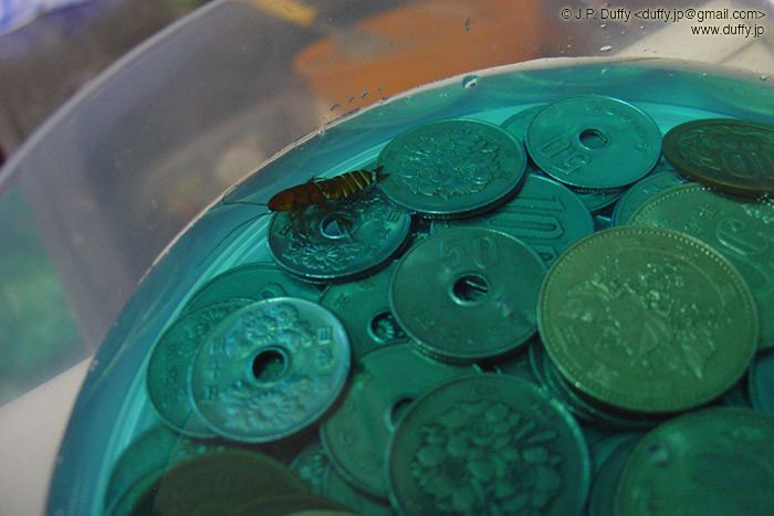 I went to grab a few coins from my change dish, (top of a DVDR spindle) and a scary cockroach squirmed around under the coins! I really really don't like cockroaches, but I can't exactly throw away a dish full of money. So I filled up the dish with blue Listerine. The beast quickly died and I could scoop him out safely.