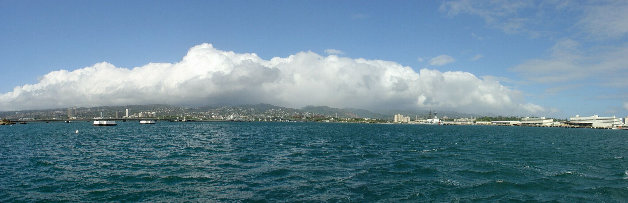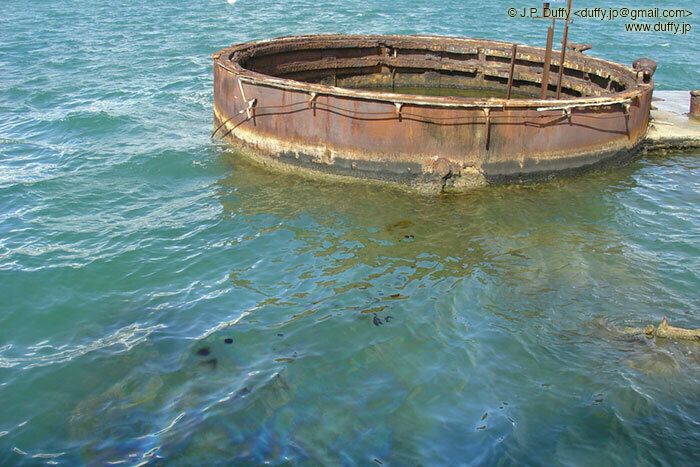 The exposed gun platform of the USS Arizona Memorial in Pearl Harbor. You can see the oil which still bubbles up 65 years after the Arizona sank.