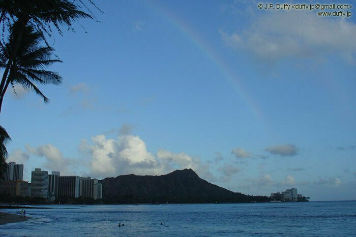 I saw many rainbows in Hawaii. The light sprinkles of rain that fall periodically each day are surely the source. This is a shot of Waikiki Beach, and Diamondhead Mountain.