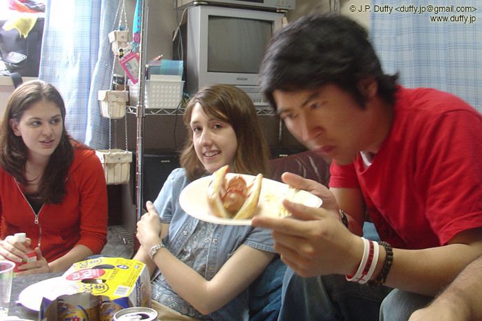 My friend inspecting his made in Japan Johnsonville Brat.