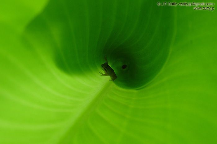 Today I went to the ocean with my friends. It was really overcast and windy, but it didn't rain! Shashi and I went swimming, but it was a bit too chilly for everyone else. Because of the wind, there was sand everywhere, so I didn't risk taking my camera out on the beach. This photo was taken near the bus stop while I was waiting to join the group on the way out. This Tree Frog is relaxing in his conical leaf-house. I love the way the plant is illuminated from the outside while the frog is in shadow. It creates an almost negative image that I think is just surreal.
