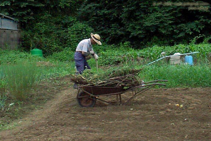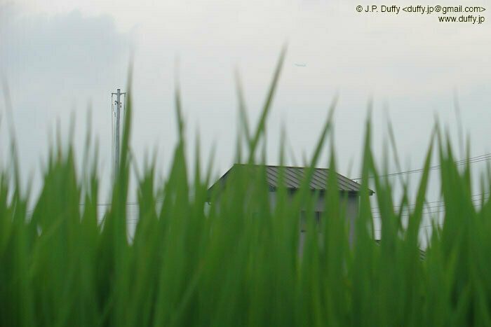I went out looking for my little green friends, but none were to be found. In the same places as Thursday the grasses were empty. I took a picture of some farmers spraying their vegetables instead. I don't know the word for "pesticide" or "fertilizer" in Japanese, so I couldn't ask which. I wouldn't have asked anyway, but it's a long story. Well, maybe I can summarize it for you. Grade school kids treat all foreigners like we're wearing Mickey Mouse costumes. Junior and high school kids treat us like movie stars. College kids think we're cool. Working age people are generally polite. But the older members of society see us as outside that society. Imagine for example, someone outside of your society. Lets say one of the space aliens from the Sigourney Weaver movies bicycles up to you with a camera and says "hi." It might freak you out.