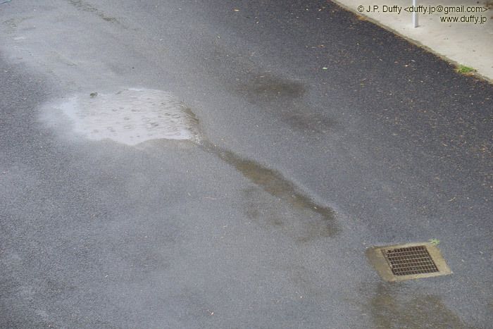 This street has been leaking water for two weeks. If you look closely, you can see the water bubbling from the man-hole cover. Actually, it's a bit small for a man; let's call it a penguin-hole cover. In any case, I'm hoping the apparent burst water pipe is repaired soon.