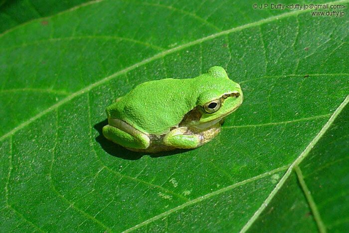 It's still a bit rainy today, but I felt like looking for Tree Frogs again-- so I went out anyway. And I'm glad I did! Along one long farm road, I found three populations of tree frogs. Two frog communities were somewhat close to each other, while the third was a good 500 meters away. The neighboring frogs all had brown stripes on their hind limbs, but the frogs in the separated area all had solid green (as pictured here). It seems the separated group is genetically distinct from the larger group.