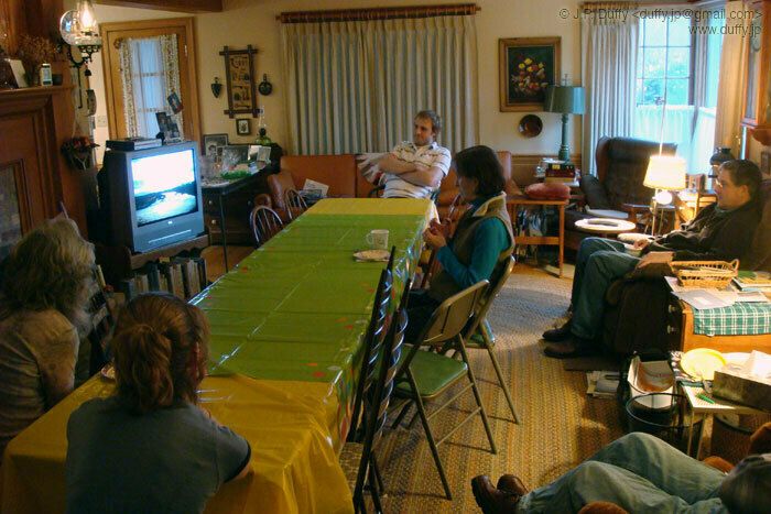 The family gathered around the TV watching a digital slideshow of my Grandpa's photos of Japan in 1955.