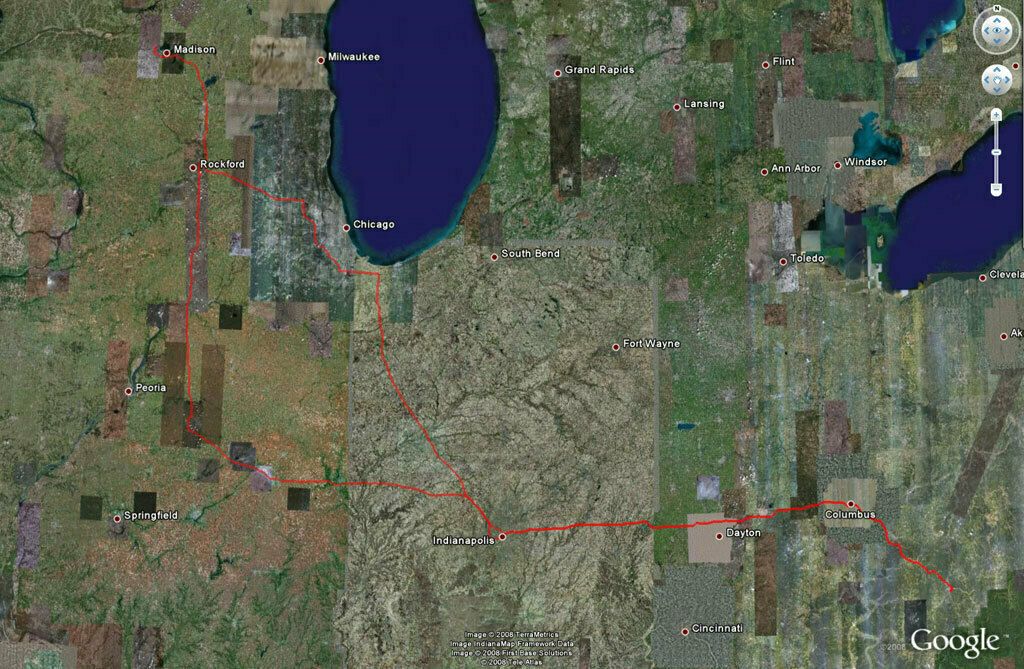 It was back to work for me today. This is a map I made from my GPS logger and Google Earth. The logger is the GlobalSat DG-100. The hardware is excellent, but the software is terrible. It took me over two hours to extract the data. Trying to copy all the data off at once (as you do normally) gave errors, so I had to manually highlight a few dozen points at a time and load, often resulting in error requiring the selection of a smaller subset. It was horrible, but I suffered through it for this map. You can see on the way home, just past Indianapolis the detour I had to take west. The highway was blocked due to an accident. Apparently it was backed up for over a hundred miles. I saw the parking lot first hand where the red track splits. Luckily my TomTom could route me around it.