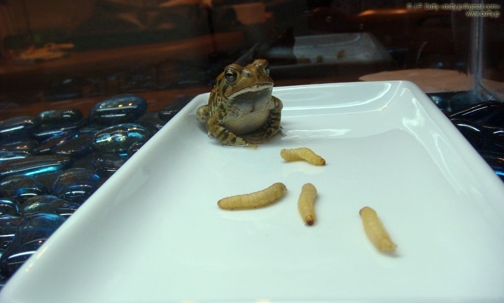 Onsokumaru was always the biggest, fastest and most active of my toads. Now that he's the only one left, he is extremely lethargic. It is an ordeal to even get him to eat. Fortunately he did eventually eat one of the worms pictured here.