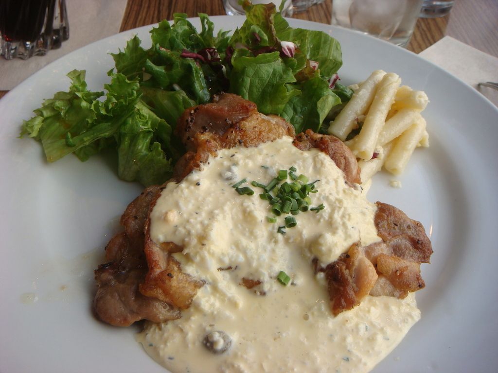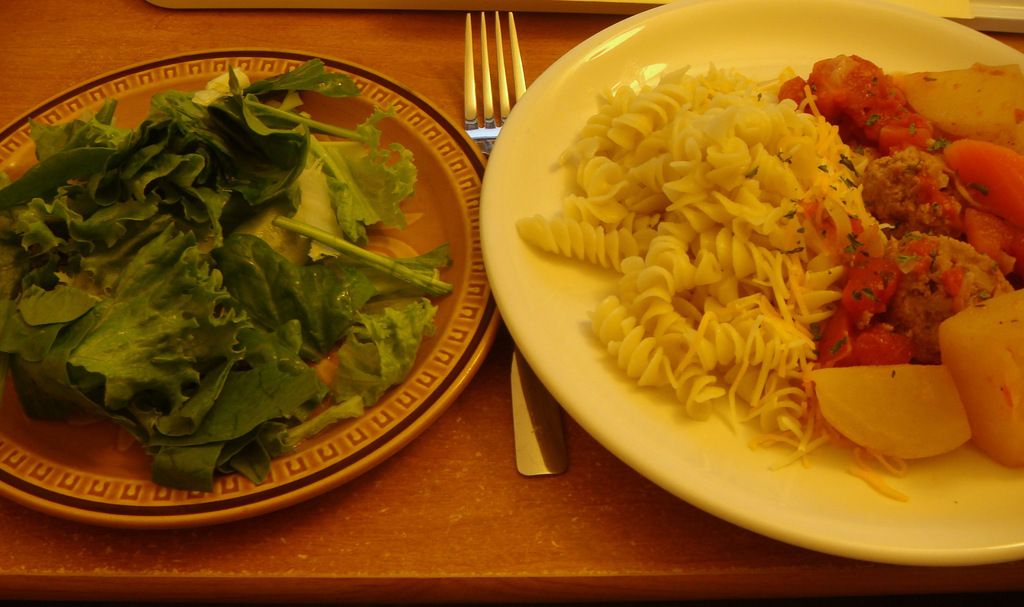 Meatball stew with pasta, and a side salad with homemade dressing.