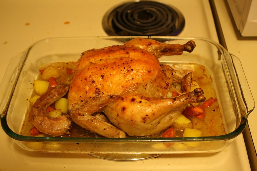 We baked a whole chicken raised by a coworker of mine. Lots of fun and tasty too. Although the neck was gross-- we're just going to toss that next time.