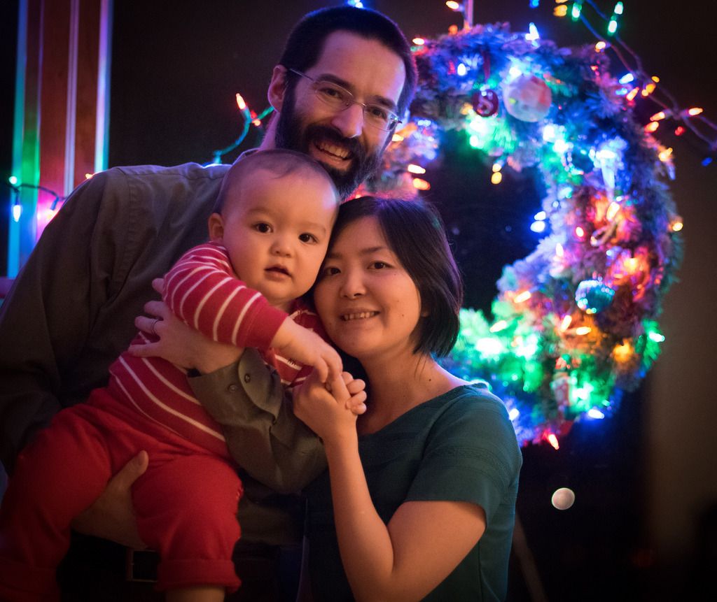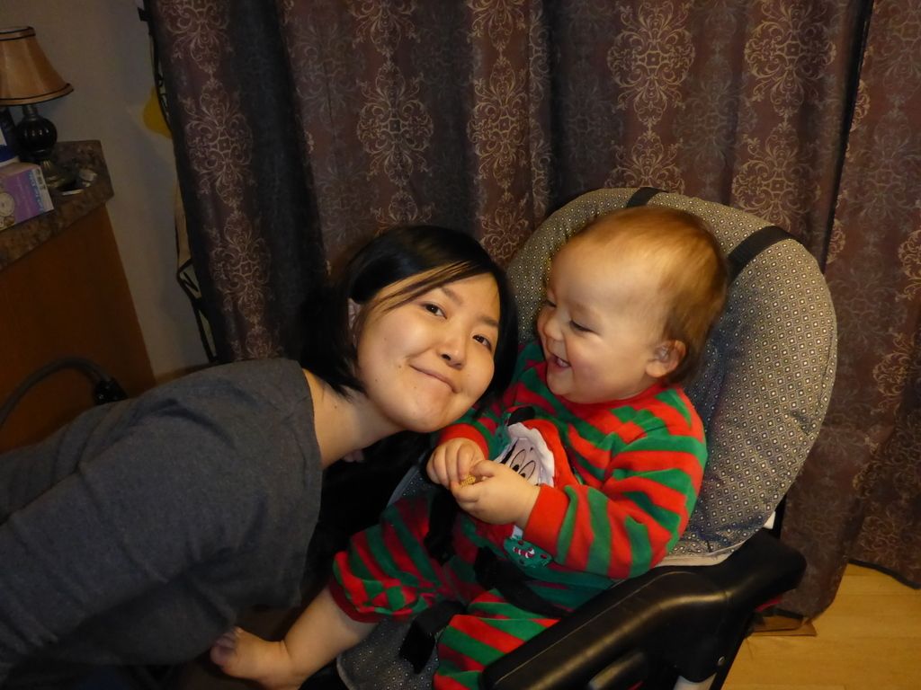 We setup a wreath after Sasuke went to bed last night, and this morning he saw it while it was still dark outside.  He pointed and said "this!  this!"  Sasuke doesn't have many words yet, but "this" is a fairly handy one to have picked up.  His first word was "Mama" at about 6 months.  Now he has "ねね" (sleep), "om nom" (eating sound), "this!" and occasionally "up!"