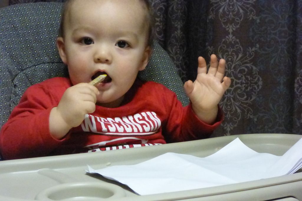 Moments after telling Sasuke "we don't eat crayons," he tests the waters.  I only had to shake my head no and he went straight back to drawing with the wrong end.