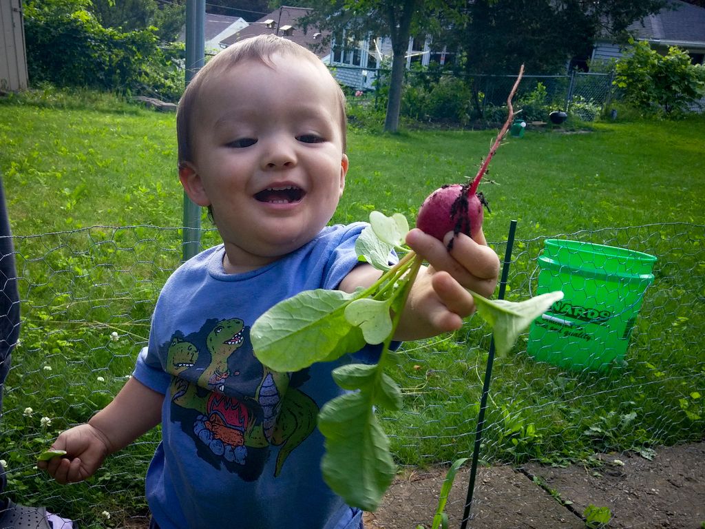 The radishes are ready! Everything is growing much much better in the nice garden soil instead of the clay we had before.