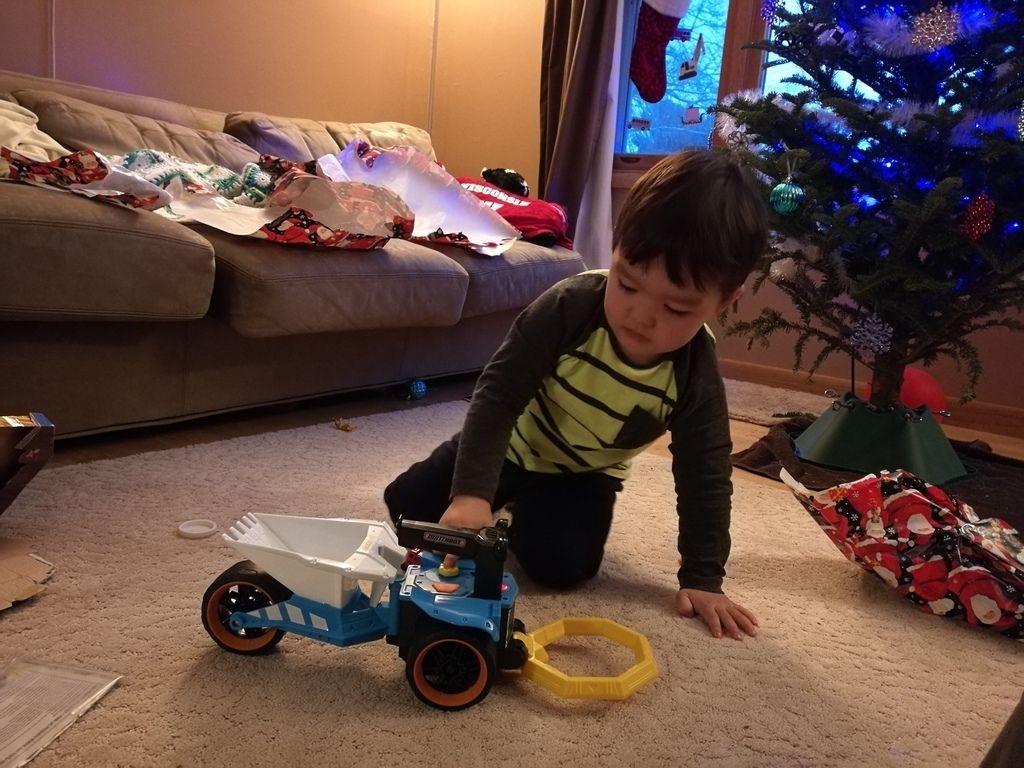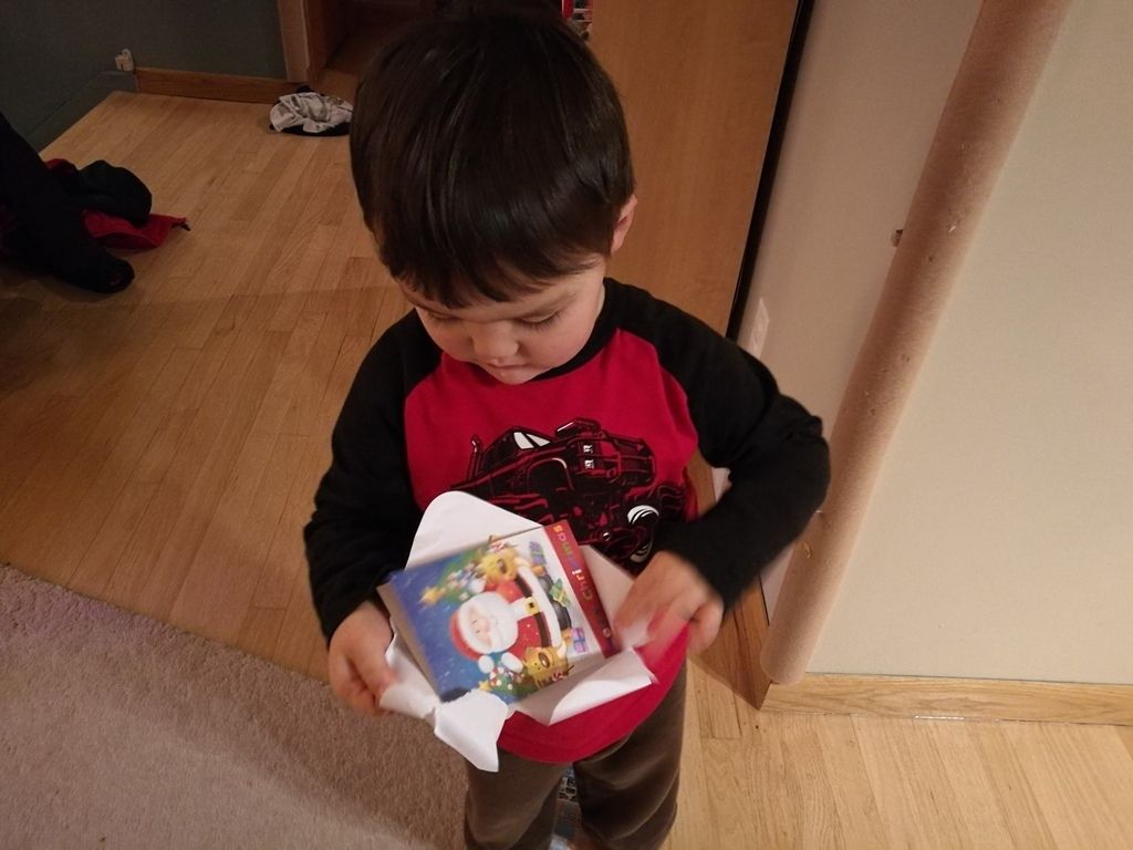 Opening a Christmas card from one of Sasuke's Great Grandma's. He liked the penguin sticker, and asked if he could keep it. The envelope itself was not so lucky.