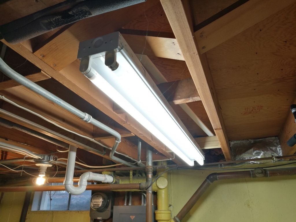 I replaced the burned out florescent tube with a drop-in LED replacement.  It's just as bright and plastic so if a broom handle or basket ball hits it you won't get shards of glass and mercury vapor everywhere.  I'm debating whether to let the other one burn out or just replace it now.