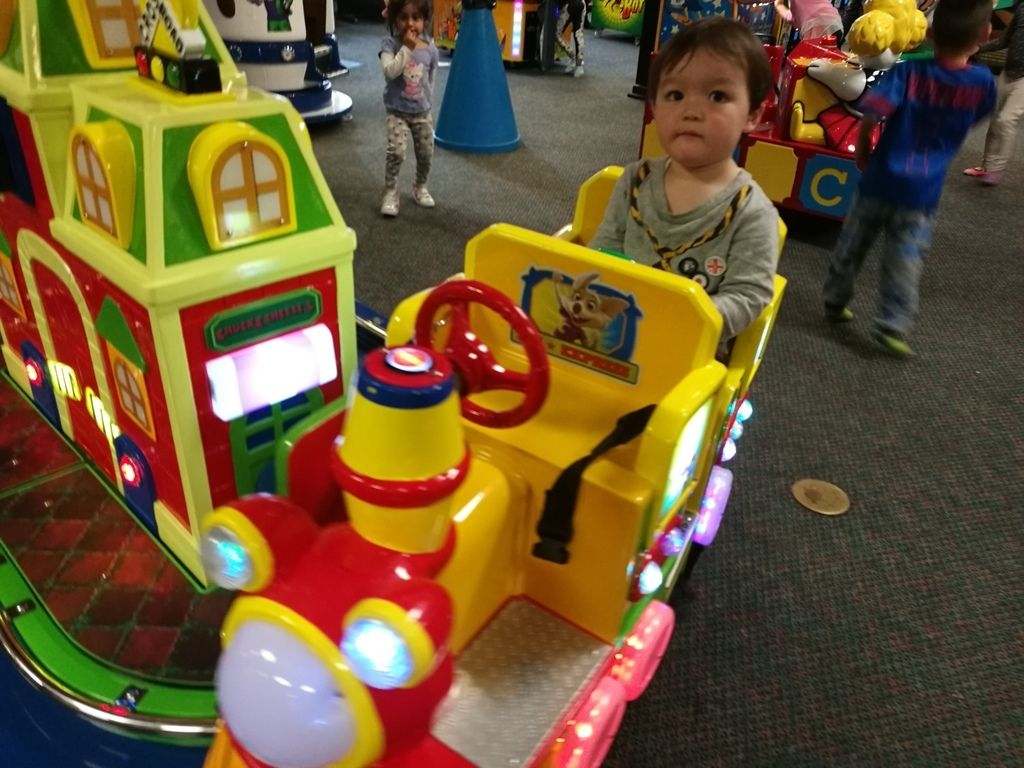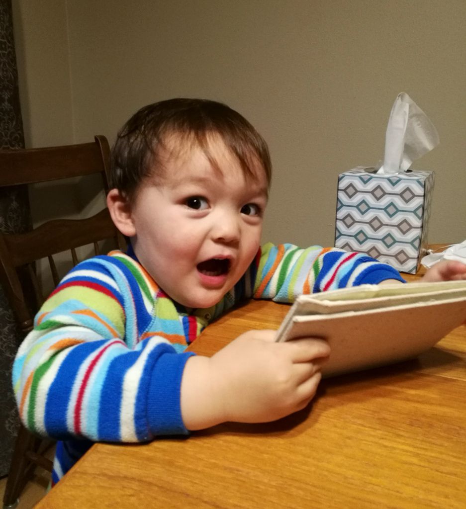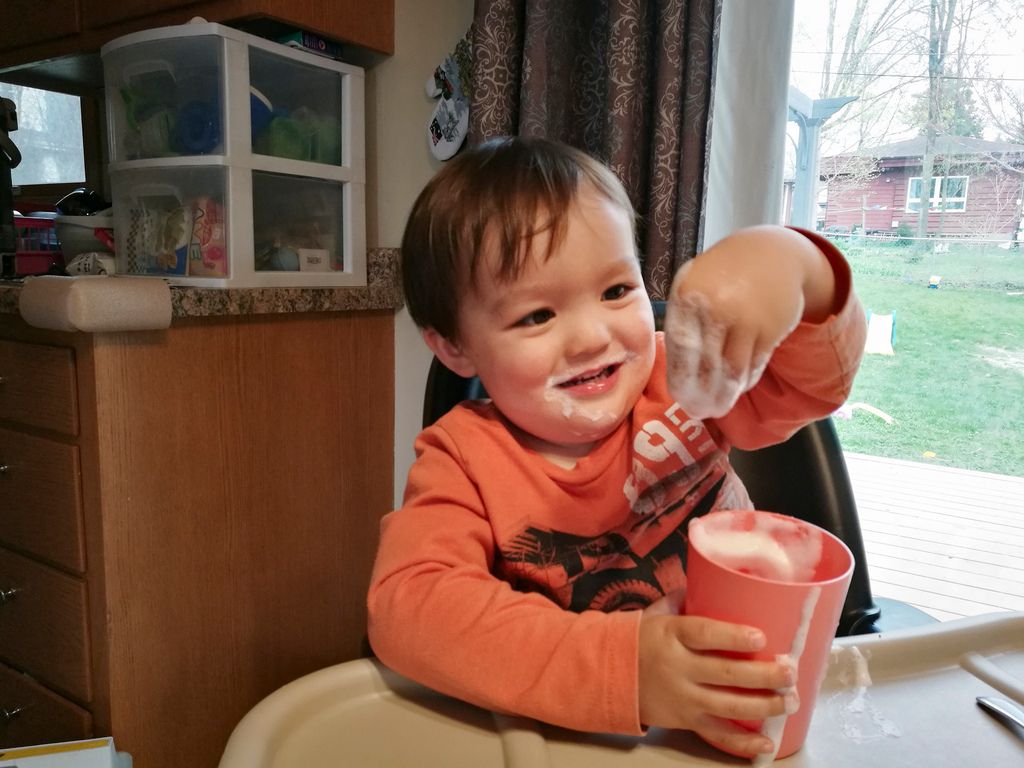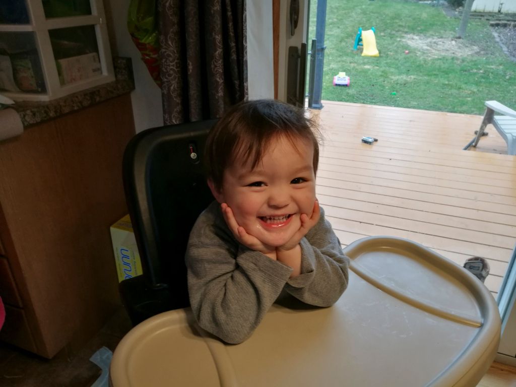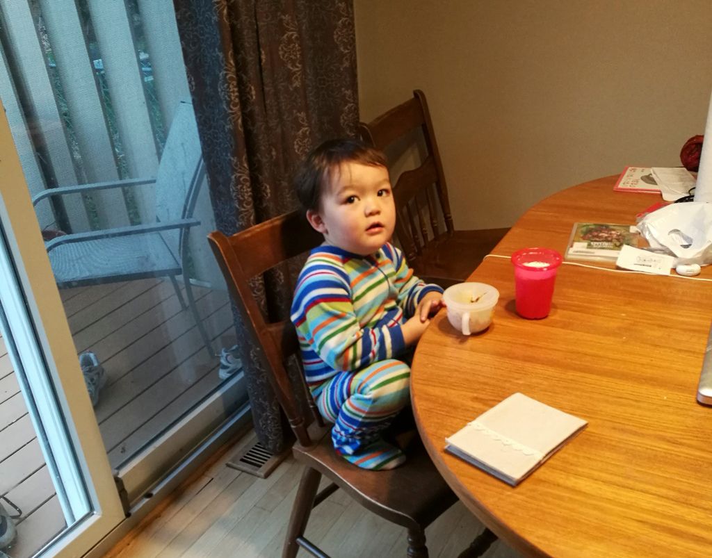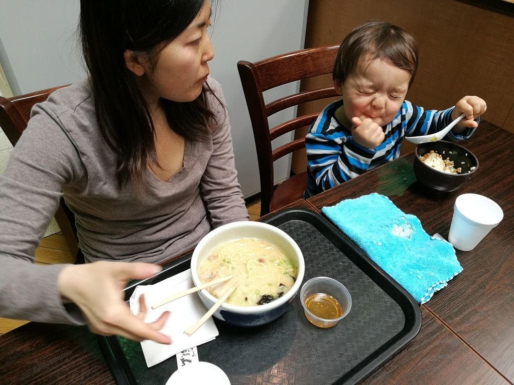 We were first in line so I could sit Sasuke right in front, but as soon as the donut was done so was he.