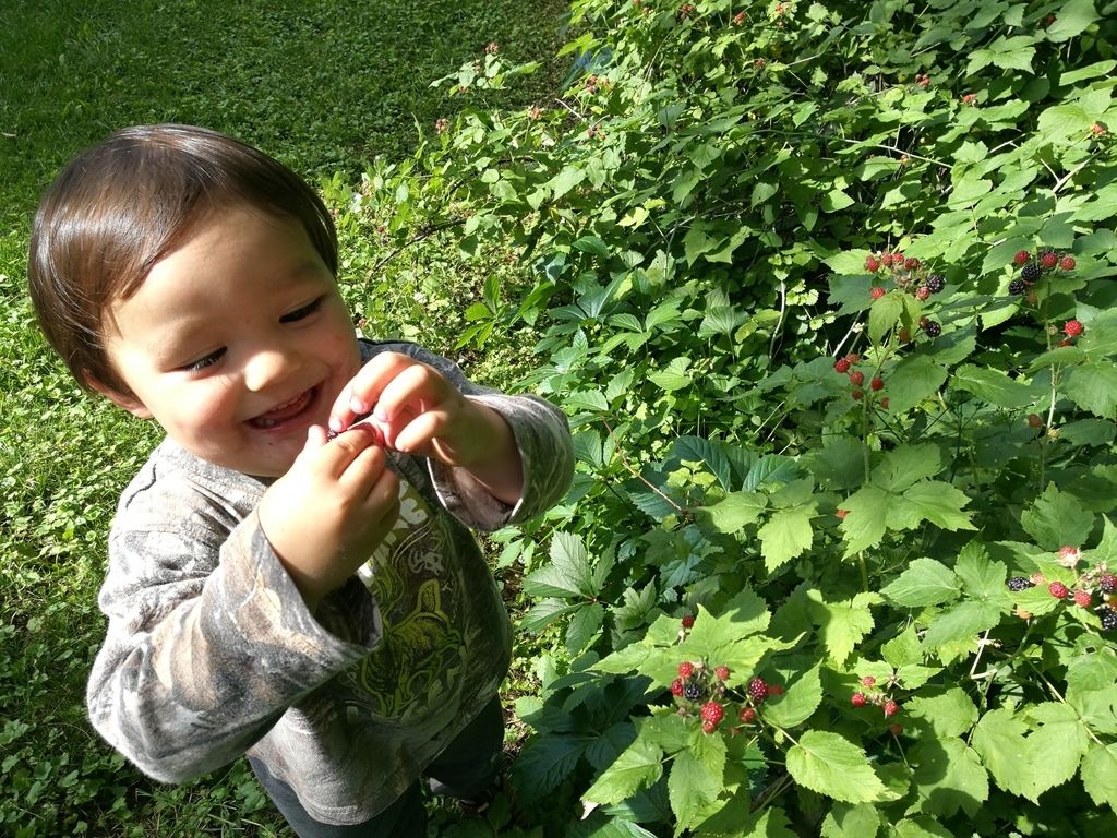 Masami took Sasuke to a strawberry farm this morning. We had some raspberries from our own patch, then we spotted these wild black raspberries at the park.
