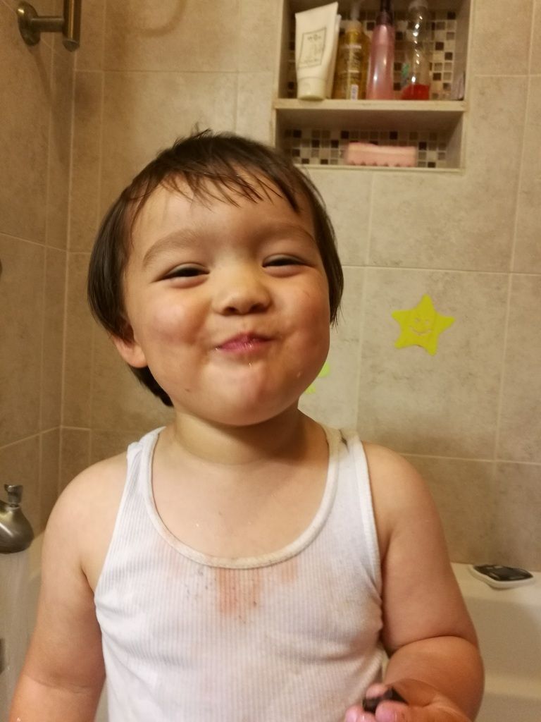 Sasuke was suspiciously quiet in the kitchen, and came out like this. Like any good Papa I took a picture before cleaning him up.