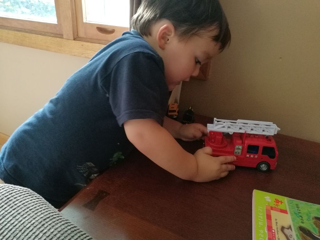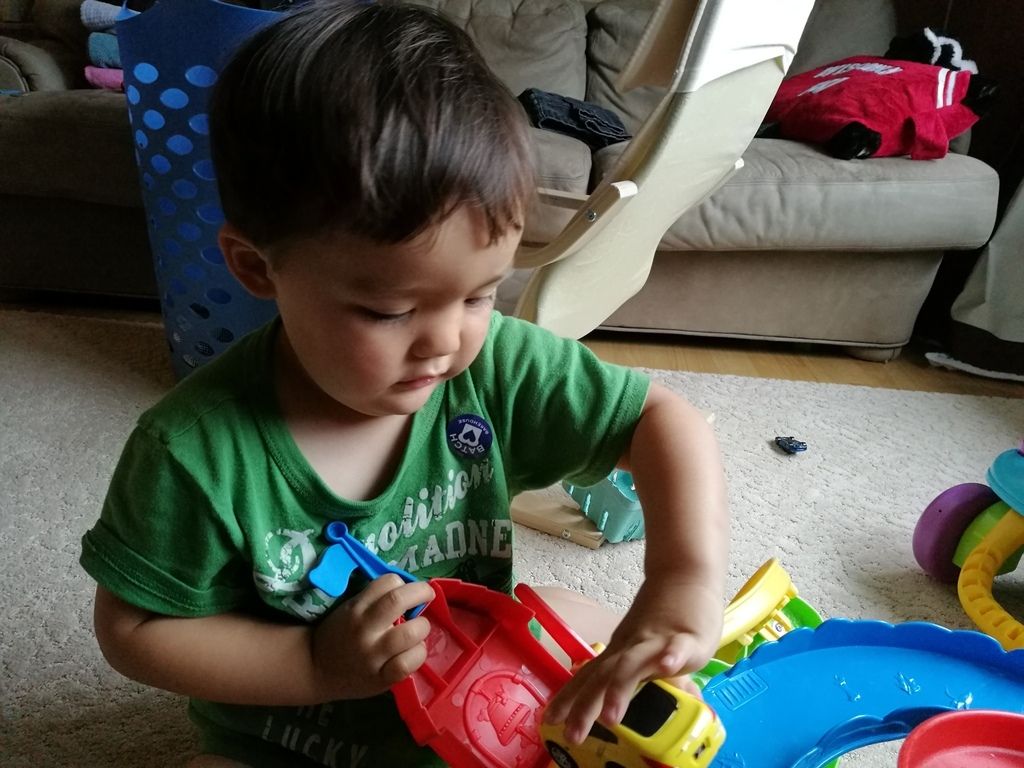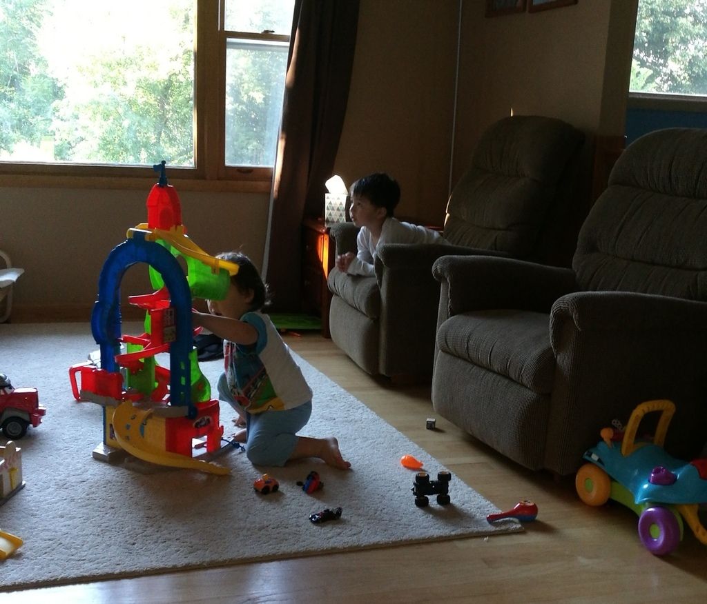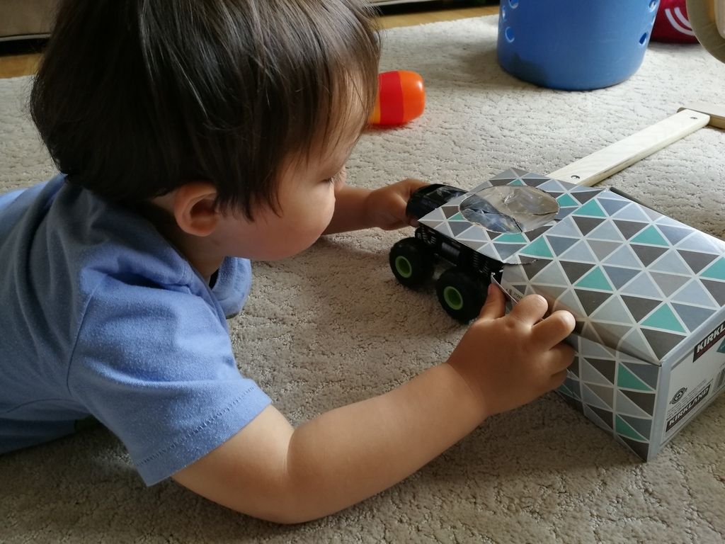 Playing with our homemade garage. The monster truck's engine kept breaking, so Tom the towtruck would fix it in his garage.