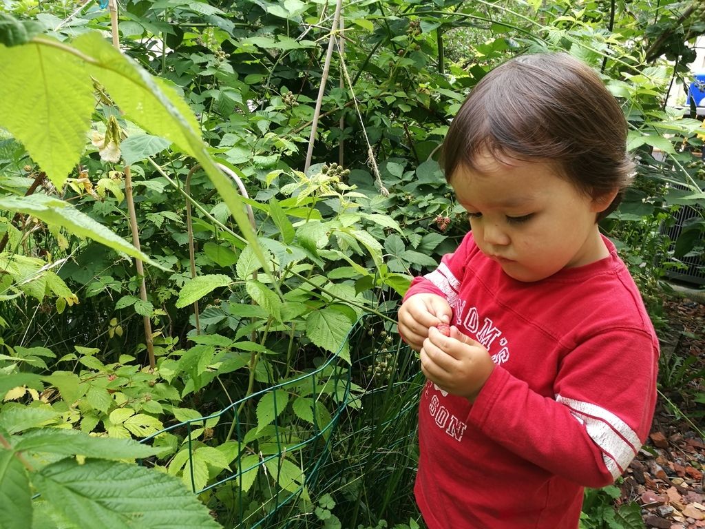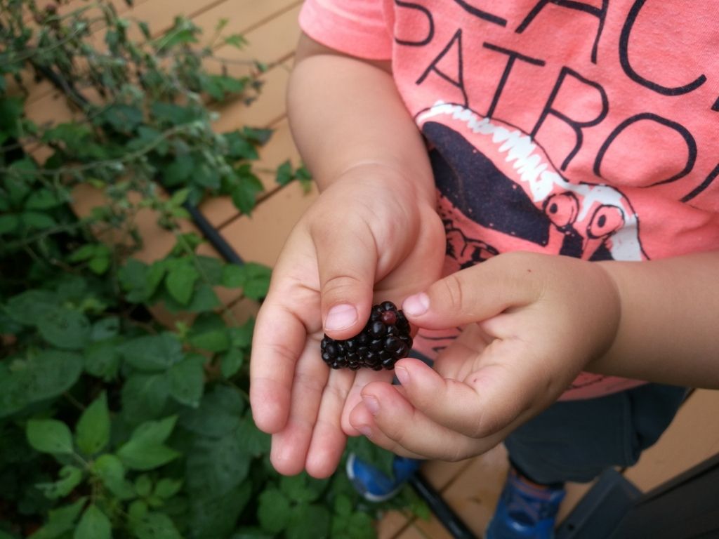The first two blackberries were ready this morning. We had to grab them quickly, the mosquitoes are out in force.