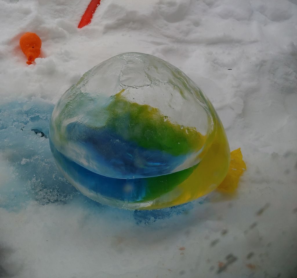 We filled a huge water balloon yesterday. I picked it up thinking it was solid but a bunch of water poured out. We tried filling the cavity with colored water.