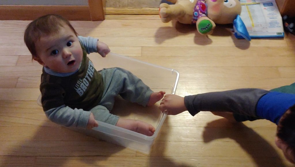 Kenny's standing up on his own, but he's not very stable so it's pretty dangerous.