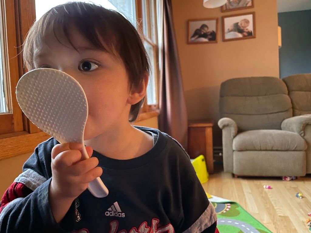 Sasuke ate his pretend ice cream at the pretend restaurant.