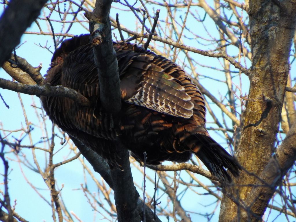 The wild turkeys sleep way up in the large trees in the patch of woods along the walk to school.